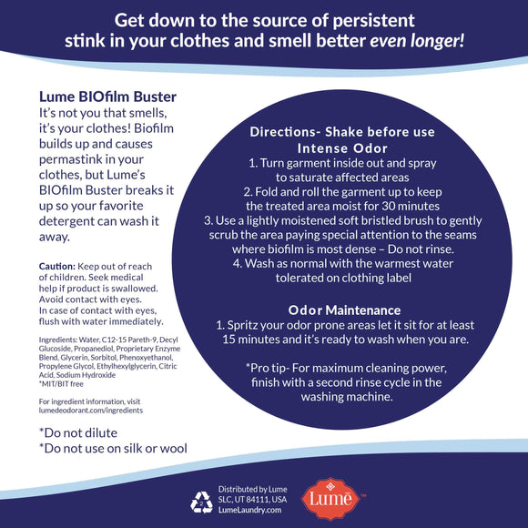 Biofilm is making your clothes stink. It’s a colony of bacteria, fungus, and mold that traditional detergents alone can’t remove from your clothes. It builds up over time and causes permastink. Lume’s BIOfilm Buster breaks up biofilm so your favorite detergent can wash it away.